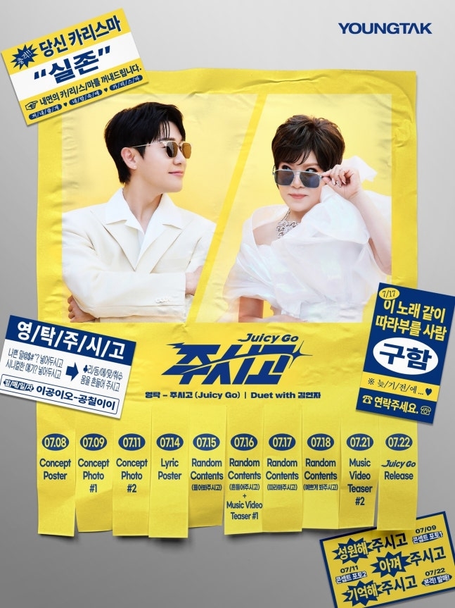 歌手のヨンタクが新しいデジタルシングル「ジュシゴ」の発売に向けて、8日からカムバックプロモーションに突入します。ヨンタクの所属会社アビスカンパニーは7日、「ジュシゴ(Juicy Go) (デュエット with キム・ヨンジャ)」のプロモーションスケジュールを公開しました。このスケジュールには、8日から22日までのキム・ヨンジャと共演したシングル「ジュシゴ」のプロモーション日程が詳細に記載されています。