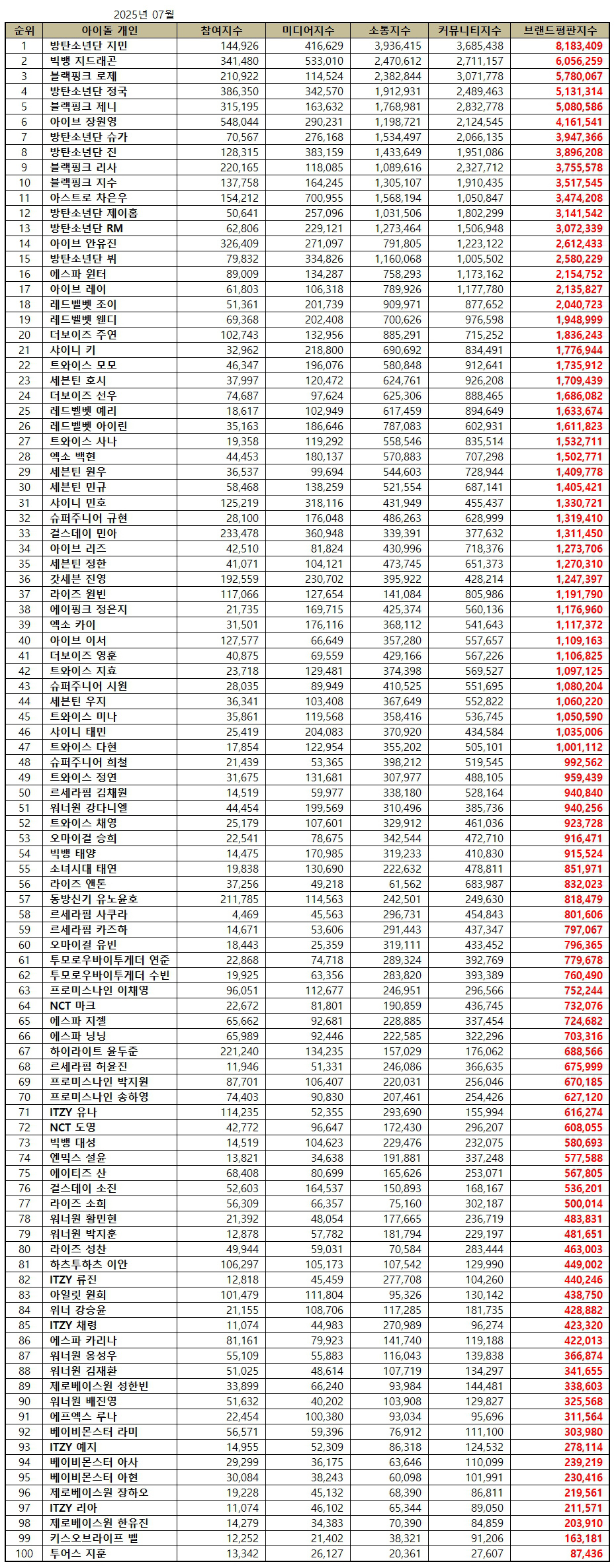 2025年7月のアイドル個人ブランド評判30位ランキングは次の通りである。1位 BTSのジミン、2位 BIGBANGのジードラゴン、3位 BLACKPINKのロゼ、4位 BTSのジョングク、5位 BLACKPINKのジェニー、6位 IVEのチャンウォン、7位 BTSのシュガ、8位 BTSのジン、9位 BLACKPINKのリサ、10位 BLACKPINKのジス、11位 ASTROのチャウヌ、12位 BTSのジェイホープ、13位 BTSのRM、14位 IVEのアンユジン、15位 BTSのV、16位 aespaのウィンター、17位 IVEのレイ、18位 Red Velvetのジョイ、19位 Red Velvetのウェンディ、20位 THE BOYZのジュヨン、21位 SHINeeのキー、22位 TWICEのモモ、23位 SEVENTEENのホシ、24位 THE BOYZのソンウ、25位 Red Velvetのイェリ、26位 Red Velvetのアイリーン、27位 TWICEのサナ、28位 EXOのベクヒョン、29位 SEVENTEENのウォヌ、30位 SEVENTEENのミンギュである。