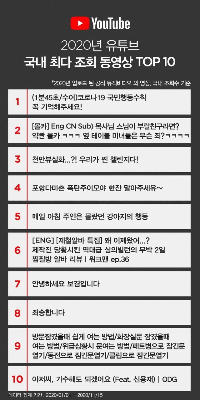 最後に浮上するグループ「OH MY GIRL」の「Nonstop」は、ドキドキする感情をボードゲームに例えた歌詞と中毒性のあるメロディで良い反応を得て10位を獲得しました。公式ミュージックビデオの他に、今年の国内ユーチューブ最多再生動画として疾病管理庁公式チャンネルの「コロナ19国民行動指針をぜひ覚えてください!」が名前を連ねました。これは今年を貫いたコロナ19の影響を改めて実感させました。また、社会的距離を実践しながらより楽しい「家コク生活」をしようとするユーザーたちのおかげでコメディアンのチャンネルやウェブバラエティ、ユーモアあふれるダンスチャレンジなどさまざまなエンターテインメントコンテンツもランキングに名前を連ねました。コメディアンのチャン・ユンソクとイム・ジョンヒョクが牧師と僧侶という異色の組み合わせの親友という状況を設定した「[モルカ] Eng CN Sub) 牧師と僧侶が友達だったら? 薬を使ったモルカ ㅋㅋㅋ 隣のテーブルの美人たちは何の罪?ㅋㅋㅋㅋ」動画が2番目に多く見られた動画に上がりました。天気予報を伝えながらジコの「Any song」に合わせて踊って視聴者を驚かせたキム・ガヨン気象キャスターの「Any song チャレンジ千万人ビュー実話...?!私たちが真のチャレンジだ!」動画は3位を記録しました。