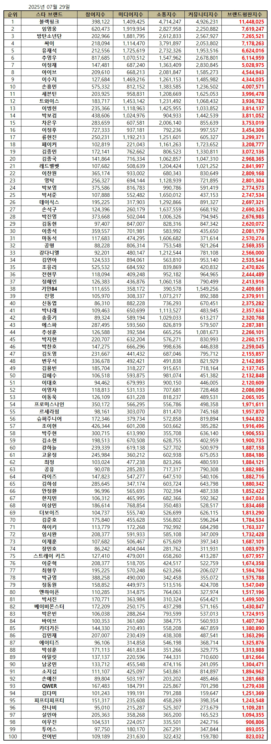 スターブランド評判2025年7月ビッグデータ分析100位はブラックピンク、イム・ヨンフン、バンタンソニョンダン、サイ、ユ・ジェソク、チュ・ヨンウ、イ・ジョンジェ、アイブ、イ・スジ、ソン・フンミン、セブンティーン、トゥワイス、イ・ビョンホン、パク・ボゴム、チャ・ウヌ、イ・ジョンフ、リュ・ヒョンジン、フェイカー、キム・ジョンミン、キム・ジョングク、レッドベルベット、イ・チャンウォン、ヨン・テク、パク・ボヨン、パク・ソジュン、デイシックス、ソン・ソクグ、パク・ジニョン、キム・ドンヒョン、イ・ジョンソク、マ・ドンソク、コン・ミョン、カン・ダニエル、キム・ヨナ、チョ・ユリ、チョン・ヒョンム、ジョン・ヘイン、キアン84、ジニョン、シンドンヨプ、パク・ナレ、ソン・ジュンギ、エスパ、チュ・ソンフン、パク・ジヒョン、パク・チャンホ、キム・ドヨン、ビョン・ウソク、キム・ヨンビン、キム・ヘス、イ・デホ、イ・ヨンジャ、イ・ドンウク、プロミスナイン、ルセラフィム、スーパージュニア、ジョイヒョン、パク・ジュヒョン、キム・ソヒョン、カン・ハヌル、コ・ユンジョン、チェ・ジョン、コン・ユ、ライジ、キム・ハソン、アン・ジョンファン、ハン・ジミン、イ・サンミン、ザ・ボーイズ、キム・ジュンホ、ハイキー、イム・シワン、イジェフン、チャン・ミンホ、ストレイキッズ、イ・ジュンヒョク、チェ・ヒョンウ、パク・ギュヨン、チョン・ドンウォン、ENHYPEN、パク・ソジン、ベイビーモンスター、パク・ウンビン、バイブ、カーダーガーデン、キム・ミンジェ、ATEEZ、パク・ソンフン、アイルリット、ナムグン・ミン、ソ・ジソブ、ソン・イェジン、QWER、キム・ダミ、フィフティーフィフティー、ジャナビ、ソル・インア、イ・ムジン、ツアーズ、チョン・ヨビンの順で分析された。