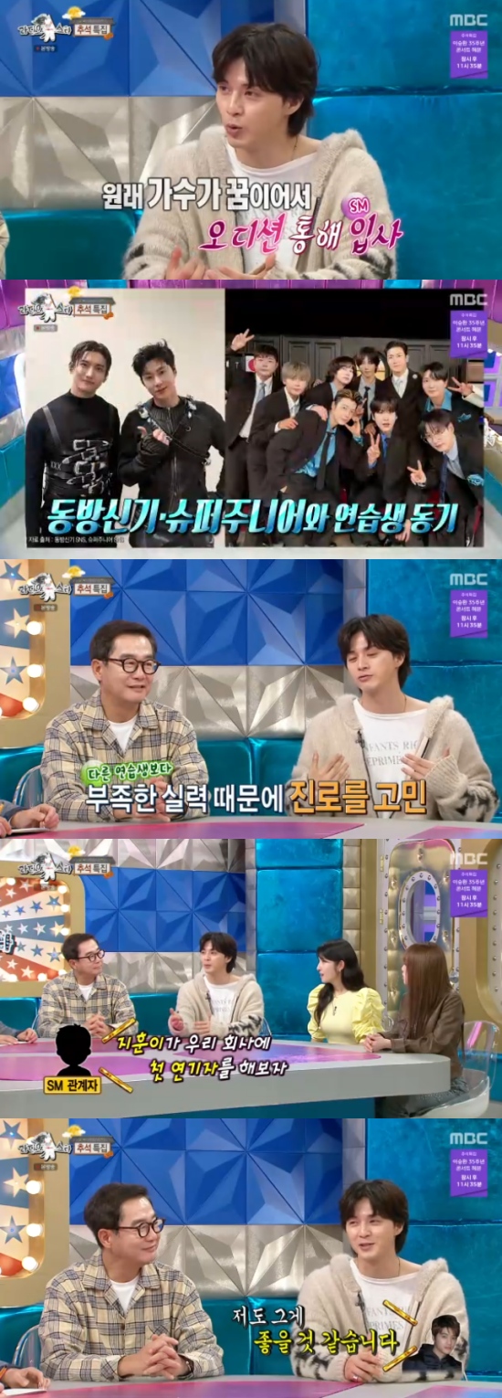 キム・ジフンはこの日の放送でかつて東方神起のメンバーになりかけた経験を語った。彼は「SMで練習していた。練習生のときに東方神起、スーパージュニアがデビューした。もともと歌手が夢でオーディションを受けて練習生になったが才能があり歌が上手い人が多かった」と回想した。キム・ジフンは「自分は歌手にはなれないと思った」と付け加えた。彼はSMでも同じ考えだったようで、その時期にSMで俳優マネジメントが始まったため演技を始めることになったと語った。