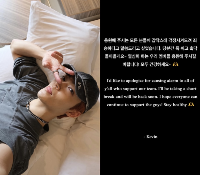 ケビンのSNS投稿全文は以下の通りである。「応援してくださるすべての方々に突然ご心配をおかけして申し訳ないとお伝えしたかったです。しばらくゆっくり休んですぐに戻ってきます。頑張っているメンバーたちを応援してください!皆さんお元気で。」