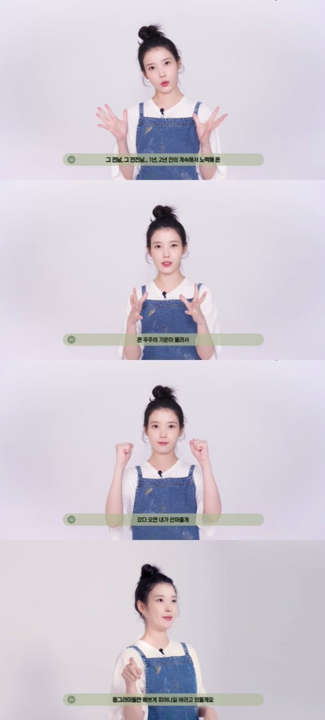 IUは受験生に「準備したことをすべて発揮してきてほしいと私は願っています」と言い、「走って行って帰ってきたユアナたちに私は両腕を広げて『よくやった。すごい。とても誇らしい』と抱きしめる準備をしている」と伝えた。