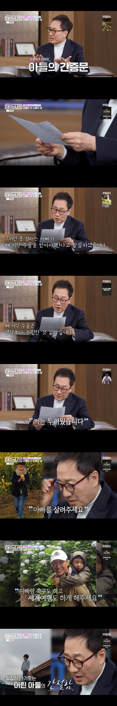 放送ではユヨルの息子が書いた文章も公開された。息子はキリスト教の学校に通い、毎年証し文を書いている。ユヨルは息子が父の辛い話を友達の前で話したくないとして発表を拒否したと伝えた。ユヨルは息子が書いた文章を自ら朗読し、「昨年5月、父がインフルエンザにかかり入院された。1週間で治ると思ったが1ヶ月以上病院にいて、母は父が肺移植手術を受けなければならないと言った」との内容を伝えた。