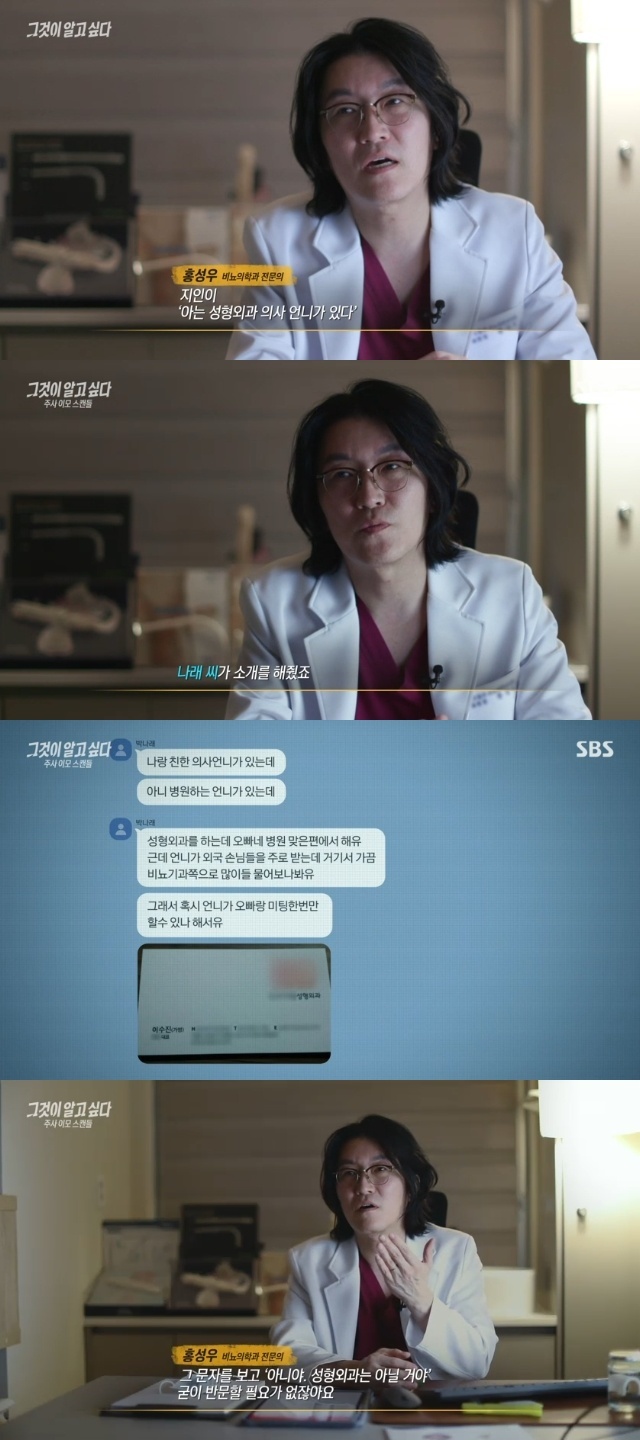 泌尿器科専門医のホン・ソンウが、放送人パク・ナレの紹介で違法医療行為の論争に巻き込まれたいわゆる「注射おばさん」に会ったと明らかにした。1月24日に放送されたSBSの時事教養番組『それが知りたい』第1473回では、パク・ナレなど有名芸能人を対象とした違法医療行為の実態を扱った。
